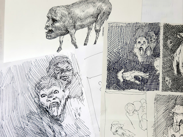 Dessins de l'Atlas des monstres connus et méconnus (éditions du Chêne, 2020), comme Kaokuima, un yōkai japonais, grand mangeur de visages, ou la Bête Humaine dont parle William Burroughs. L'Ivunche (ou Imbunche) de la mythologie Mapuche, est un bel enfant changé en esclave difforme par des sorciers ; le Mapinguari, mythique singe cyclope du Brésil, ou Krasue, monstre ou "phi" thaïlandais, mangeur d'entrailles. Quant à l'enfant Choyke (ou enfant-autruche), et Monopaharo, singe-oiseau, ils font partie des Êtres et Bêtes de la Pampa de Alfonso Espinosa y Cano.