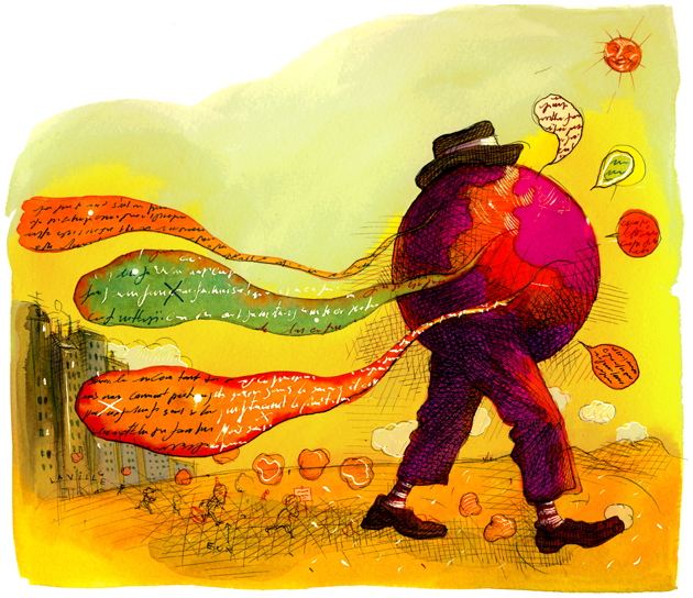 /// Ilustración para la revista Foreign Policy. El artículo se titula "Ban-Ki MoonEl pequeño hombre gris de las Naciones Unidas" y yo intenté dar esa idea de un traje demasiado grande... Hay un poco de todo en el dibujo, tinta china, collage, acuarela y sellos.